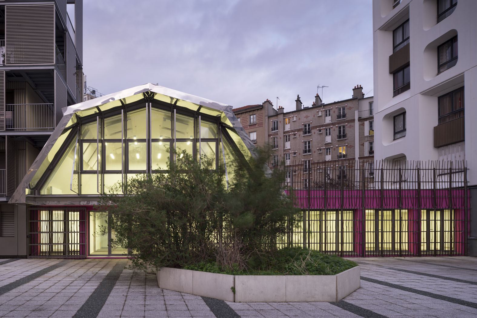 In search of the light: Bruno Rollet began the project “from the ground”, starting off with the principle that he would conserve the plinth of the former commercial center. And then he decided to search for the light, in one way or another, for the once “blind” building to relate the slab to a garden that turns its back. The contribution of light materializes on the first floor through the large window bay: “the cantilevering room that watches the neighbourhood”. Versatile, it will function for a wide range of activities (social support, French language classes and academic coaching).”We recognise that its shape resembles the greenhouses of the park des Lilas and to the Candide building that I realised in Vitry. The greenhouse appears since 2005 in my projects like an element that fuels the work of the agency”.
