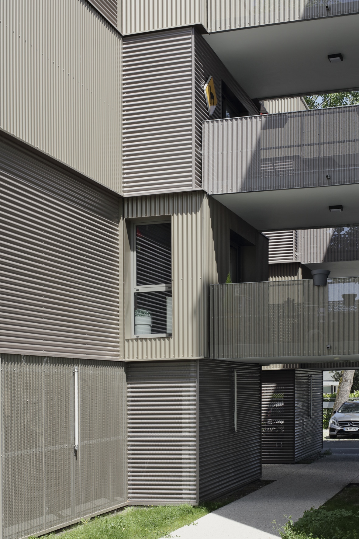 Mais puisqu’il fallait tout de même prévoir des espaces de stationnement, il a décidé de les implanter en rez-de-chaussée du bâtiment.