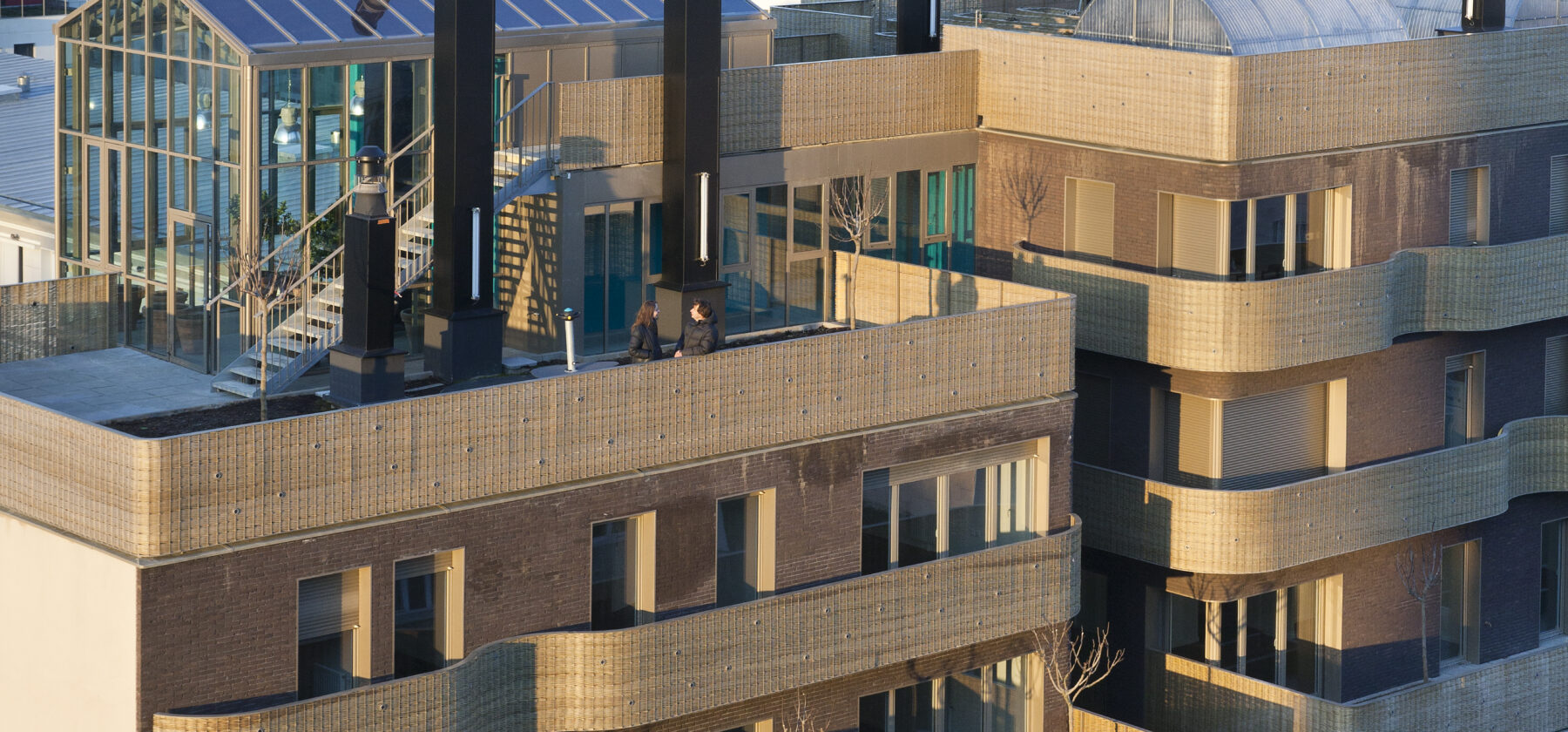 Les séjours, situés en angle, sont parfois prolongés par des loggias. Le jardin est planté autour de l’immeuble. L’osier et la brique l’enveloppent. Les balcons tressés, comme une dentelle, l’entourent. Ce projet apporte une nouvelle réponse, au regard du quartier et du paysage: une façon de construire autrement pour habiter autrement.