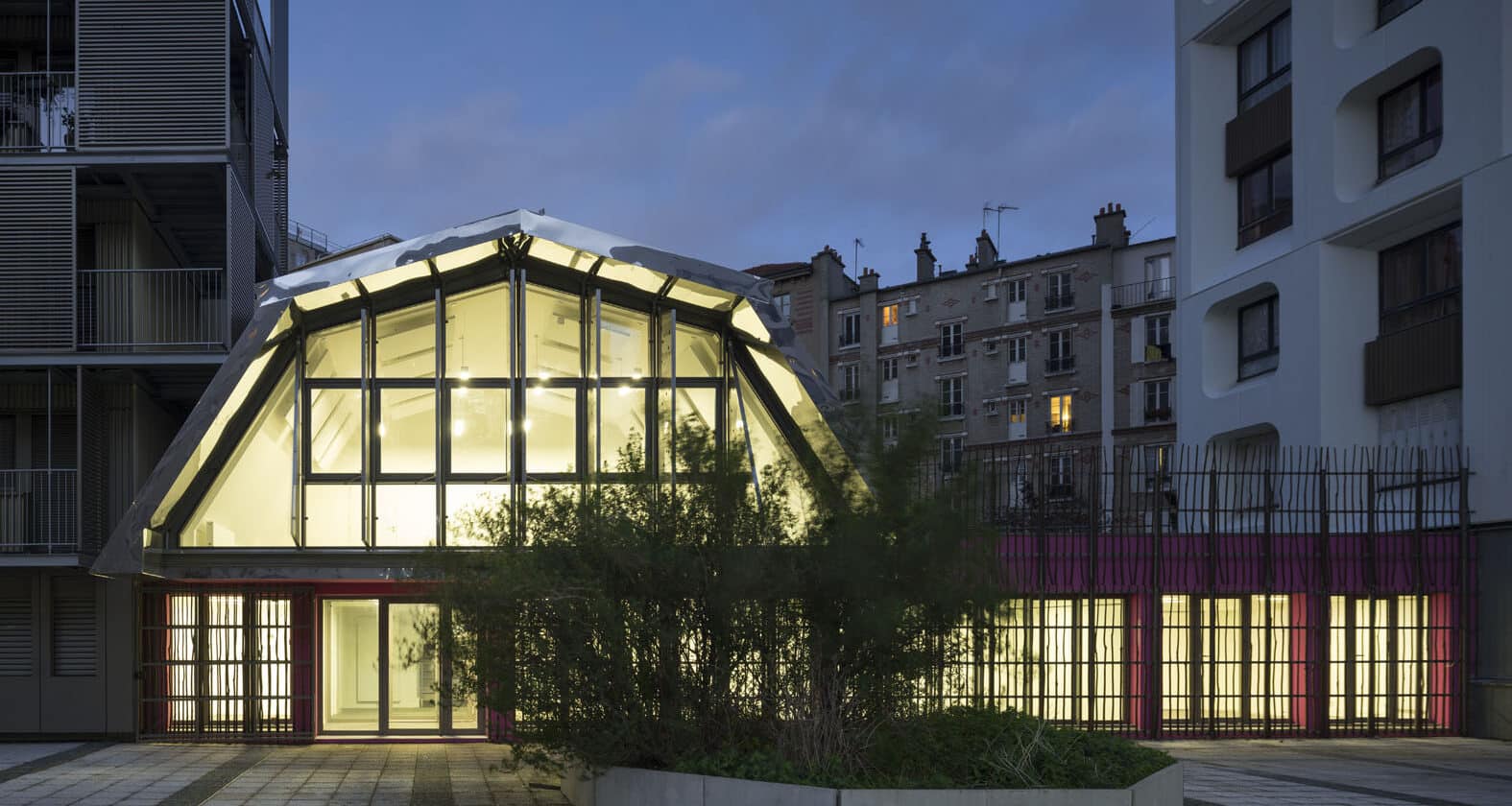C’est un exemple de rénovation ou de rajeunissement d’un quartier de Paris fort bien mené. Ou comment l’architecture peut aussi construire « le lien social » entre « deux parties du 20° arrondissement ». Dans l’ancien village de Charonne, un peu en retrait du triste boulevard Davout, ce projet a été conçu et réalisé par l’architecte Bruno Rollet et son agence. Il raconte comment il a conduit la transformation du Centre social Saint-Blaise du square Vitruve, au pied d’une tour de 85 mètres de haut, sur une dalle recouvrant trois niveaux de stationnement. Le square, ici, est réduit à sa plus simple expression et jouxte une immense dalle de béton ; les habitants de la tour ont une vue plongeante sur le Centre social. Bruno Rollet a donc tout fait pour le rendre plus beau et attrayant pour les habitants. L’objectif est de les faire entrer dans ce local, « le lien social » alors sera établi. Le nouveau bâtiment, avec son toit en inox reflétant le ciel et ses gaulettes de châtaigniers sur sa façade, joue sur le concept de « nature importée ». La dalle Vitruve a gagné ainsi en humanisme et joie de vivre. Ce projet de rénovation s’imposait pour une dalle portant le nom d’un architecte romain. Et où, non loin de là, au 50 rue Vitruve, – comme le rappelle une plaque – une jeune femme qui allait bientôt être connue sous le nom de Barbara a vécu de 1946 à 1959. Elle chantait quelques années plus tard Et faire jouer la transparence au fond d’une cour aux murs gris où l’aube aurait enfin sa chance…