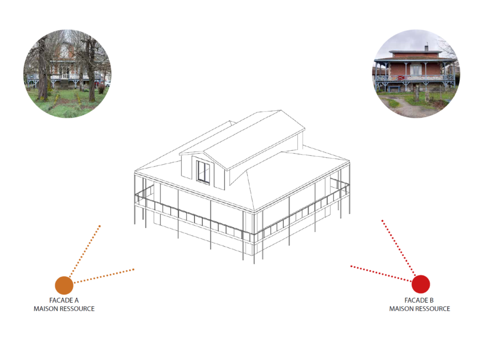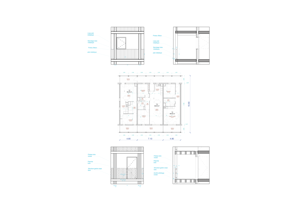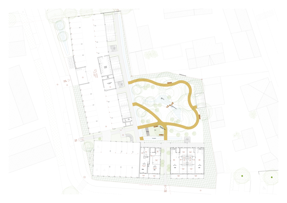 étage est construit en retrait. Notre projet de logements collectifs naît de l’observation de cette maison. Il se compose de deux immeubles le long de la rue. Le stationnement s’organise au rdc, les logements sont installés dans les étages. Ils sont tous traversants, ou à 3 orientations.